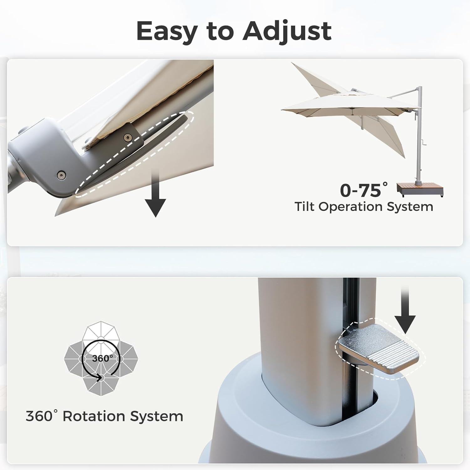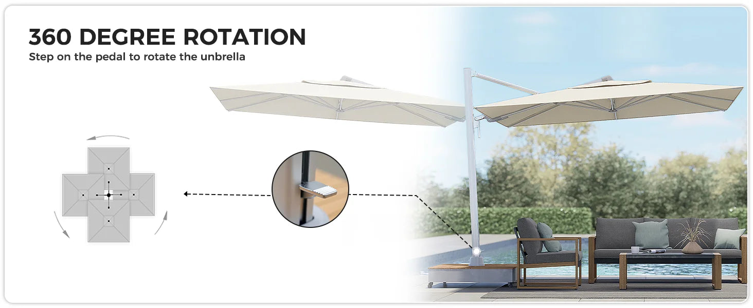 You can step on the foot pedal at the base to rotate the umbrella pole for a 360 degree rotation. Additionally you can use the switch on the pole to achieve a 75 degree tilt adjustment from side to side for maximum shade.