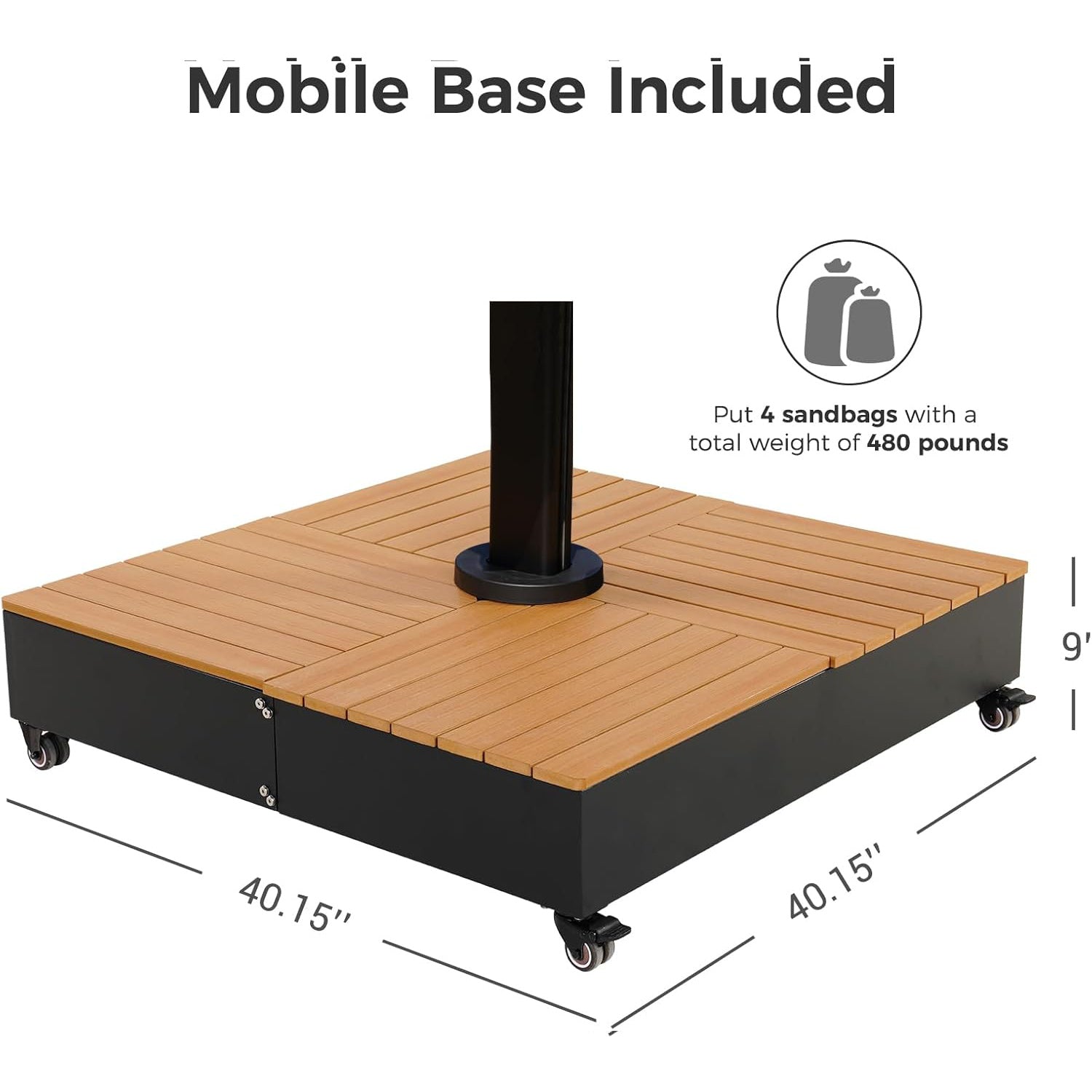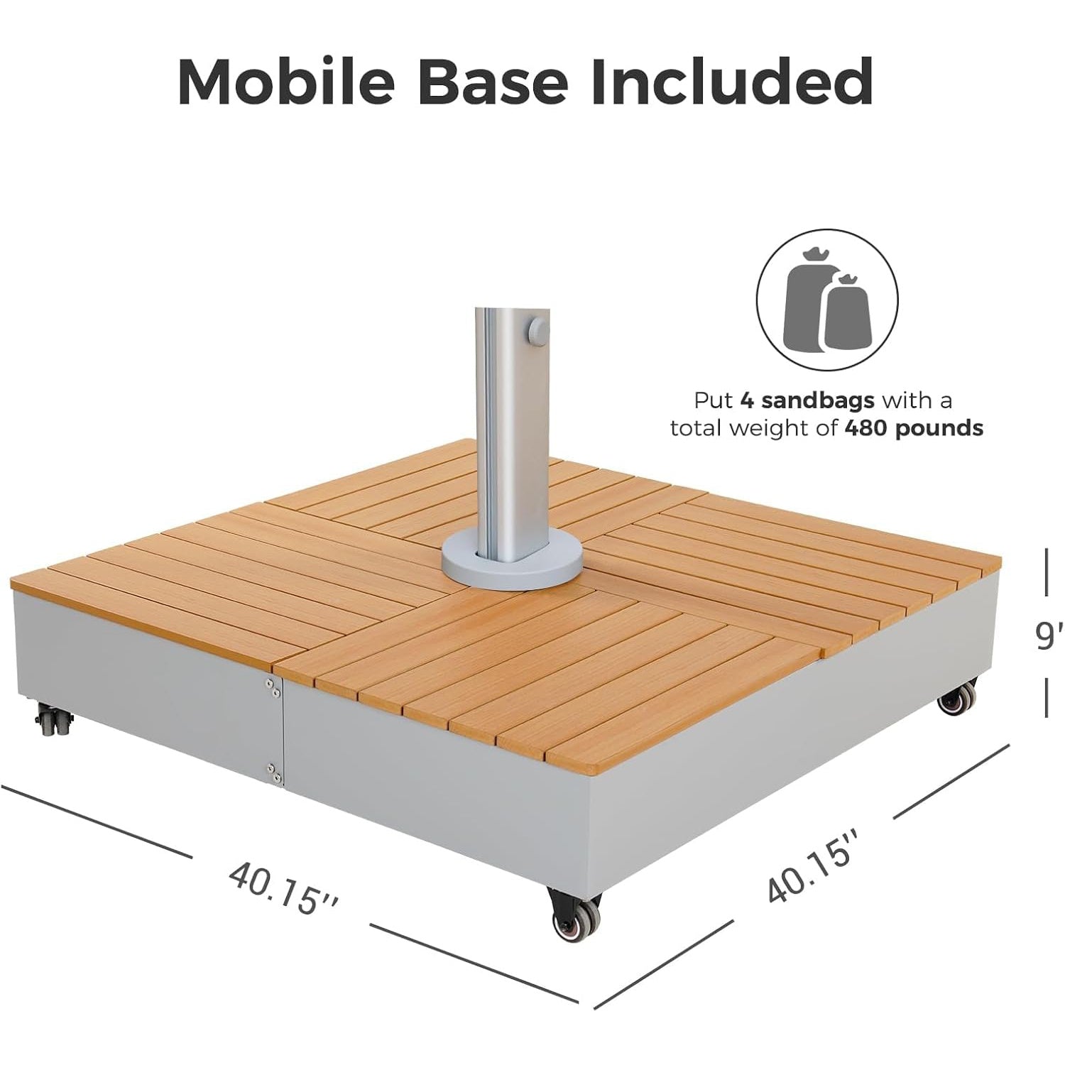 The umbrella base contains four sandbags that hold a total weight of 480 pounds of sand for stability.
