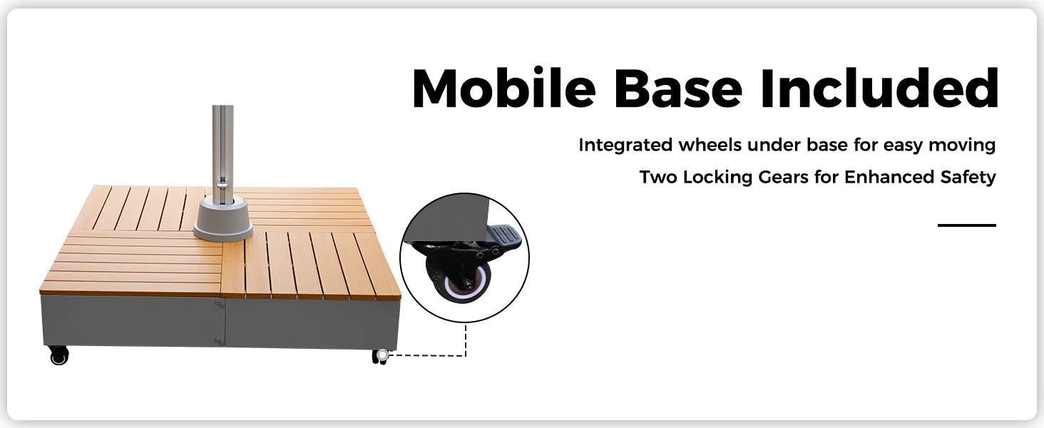 You will get this patio umbrella with a mobile base and a free umbrella cover. Notice: This base will be sent to you in a seperate package.